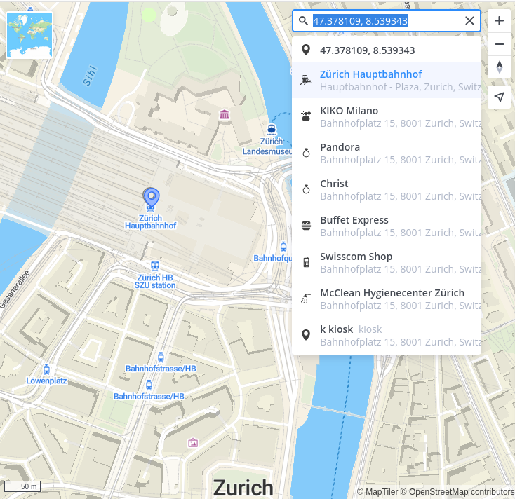For the reverse geocoding, the nearest feature is returned to the search results list.