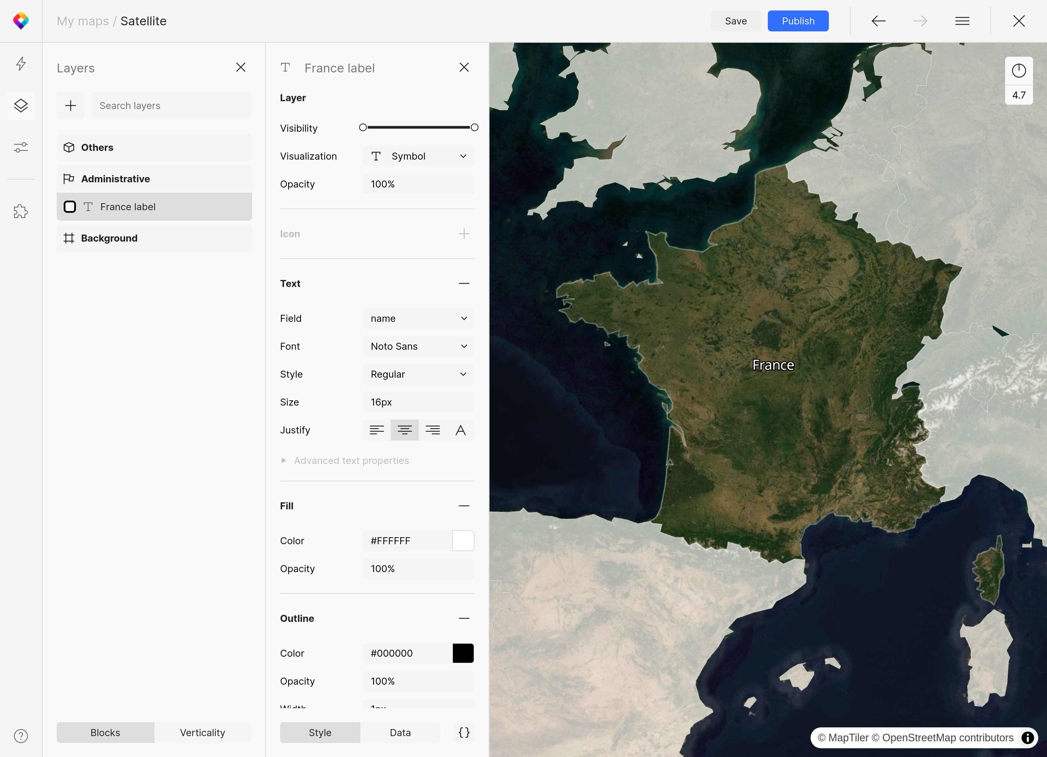 Create a new empty map from your MapTiler account, and select the Satellite tileset in the data sources window. Add the Countries tileset data source the same way as Satellite.