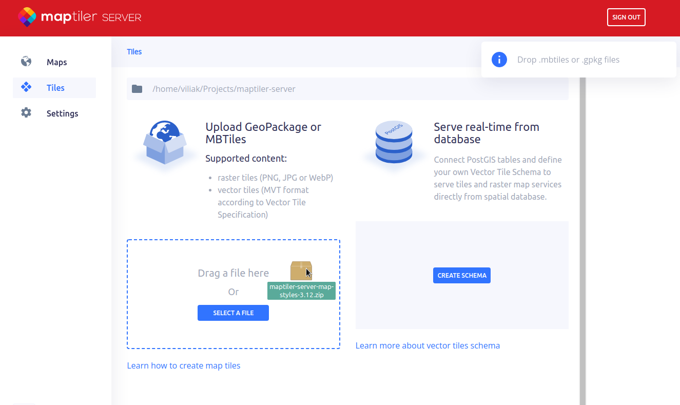 Another thing that needs to be done to make serving tiles functional is providing a style so the data can be displayed correctly. For this purpose, you can use the startup package prepared by our team that already includes some default styles (Basic, Bright, Satellite-hybrid, Streets, Topo) and sample datasets with the location of Zurich, Switzerland (maptiler-osm.mbtiles and maptiler-satellite.mbtiles). You can just drag \& drop this package to the Tiles page of the server’s admin interface and the subfolders structure will be prepared automatically in its working dir.