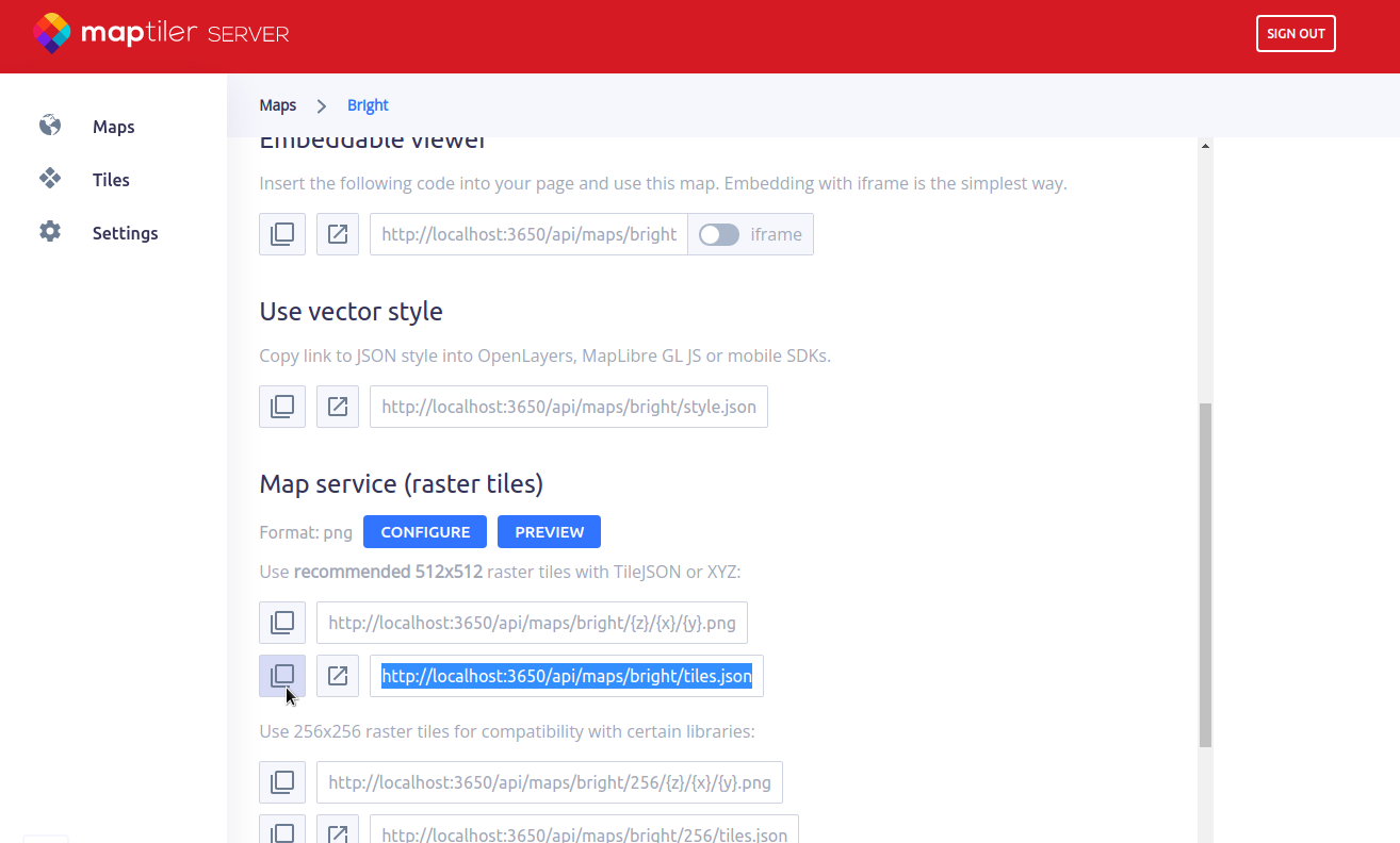In the server’s interface, navigate to the maps section and select Outdoor map. Here scroll to the Raster tiles section, get the URL for 512x512 tiles