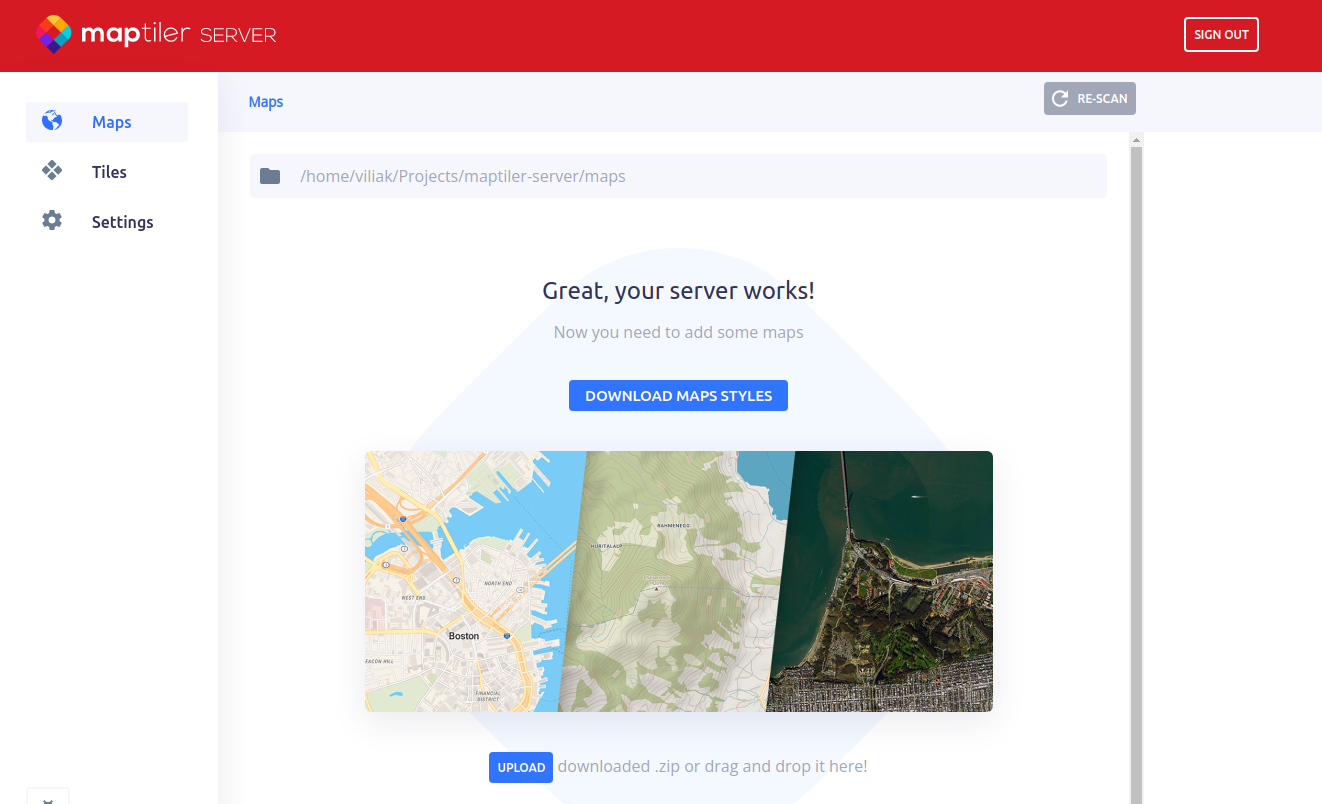First of all, you’ll need a working MapTiler Server on your computer. After downloading the installer from MapTiler Server download page, follow these installation instructions. Once the installation is successfully finished, you should be able to get to the server’s admin interface in your browser.