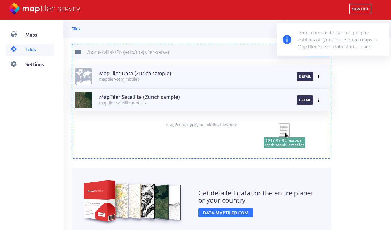 The next step will be getting a dataset we want to serve as the custom basemap. You can go to the download section of MapTiler data and choose the one that suits your location and style requirements. For this tutorial, we’ll go with OpenStreetMap vector tiles for the Czech Republic dataset. If you have trouble getting your data, check the article on this topic. Once you have your dataset downloaded, you can upload it to your running server by dragging \& dropping it to the Tiles section of the server’s interface. If you want to avoid watermarks in your map, you can upgrade to licensed MapTiler Server according to the current pricing plan.