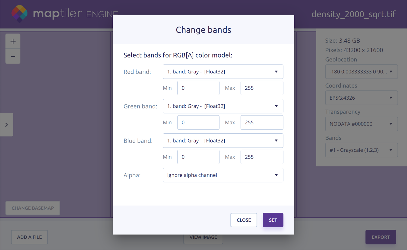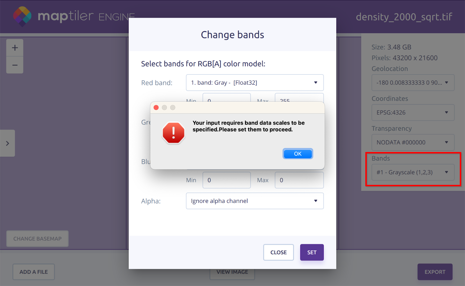 Proceed to specify the data scaling values for each image band. If the dialog doesn’t pop up automatically, open it via the Bands menu > Change bands.