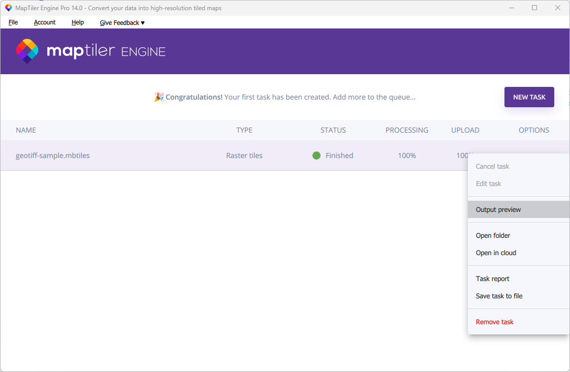 MapTiler Engine starts processing the file and you can watch the status and progress. Once it’s done, go to Options > Output preview.