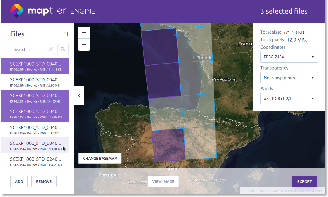 Within the default view of the file list you can either manipulate with a single file or with multiple files at once. To add more files to the selection, simply hold the Ctrl key while selecting additional files. Files can be selected from the list or from the map (in the “Footprint” map mode). By adding files to the selection, your right-hand details panel will allow you to perform changes to all selected files at once.