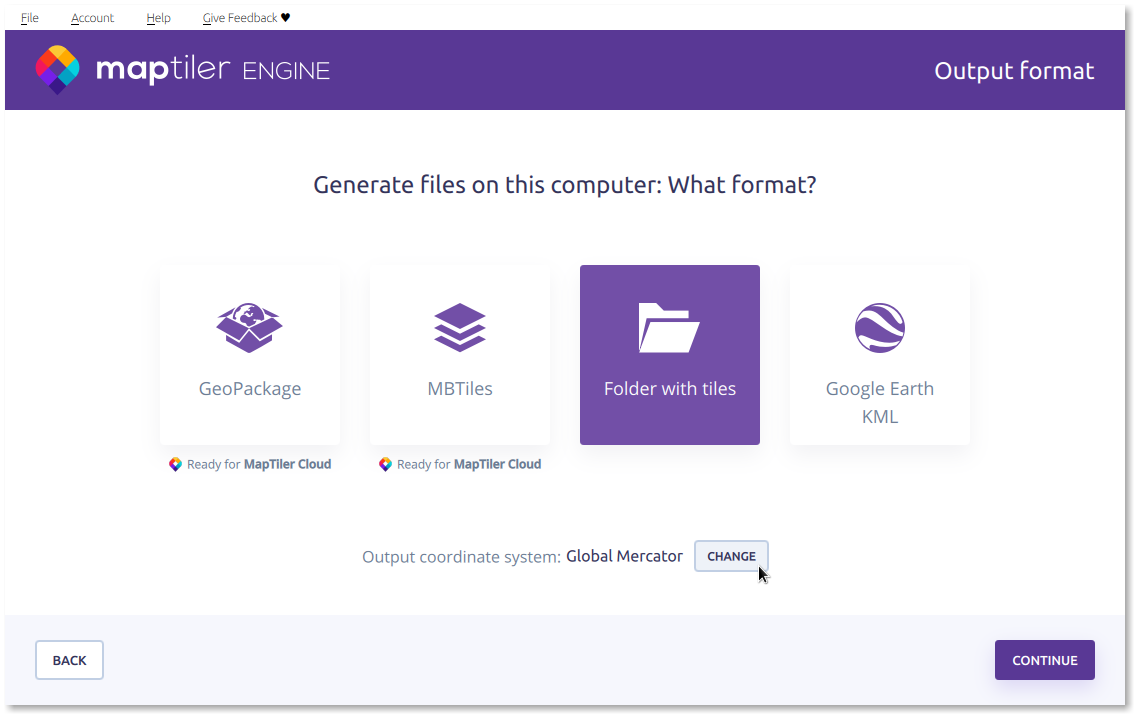 Select the output format as “Folder with tiles“, then click “Continue“. This option is best for uploading the final image to your own file hosting via FTP. If you select the GeoPackage option, you can upload the image directly to a 3rd party cloud hosting service and serve it to your users from there. More info about hosting is here. Do not try uploading a GeoPackage with a tiled image to MapTiler, as MapTiler does not support the rasterized GeoPackage.