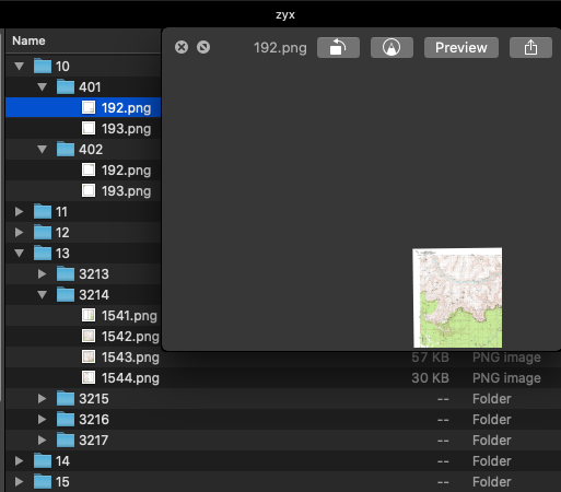 The map tiles are structured into folders, and the final tile image is a file within one of these folders. Each zoom level is a folder, each column is a subfolder, and each tile in that column is a file. The folder structure depends directly on the tiling scheme and will be defined below for each available scheme in MapTiler Engine.