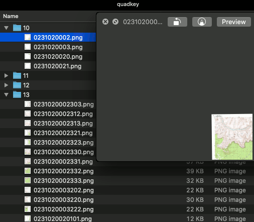 To optimize the indexing and storage of tiles, the two-dimensional tile XY coordinates are combined into one-dimensional strings called quadtree keys, or quadkeys for short. Each quadkey uniquely identifies a single tile at a particular level of detail, and it can be used as a key in common database B-tree indexes.