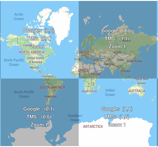 There were defined multiple world-known standards for naming map tiles. The most popular and world-used scheme used by many map providers (such as OpenStreetMap, Google Maps, MapTiler, Mapbox, …) was defined by Open Geospatial Consortium (OGC) in the WMTS standard definition released in 2010 and is simply called XYZ, or sometimes precisely ZXY (see later).