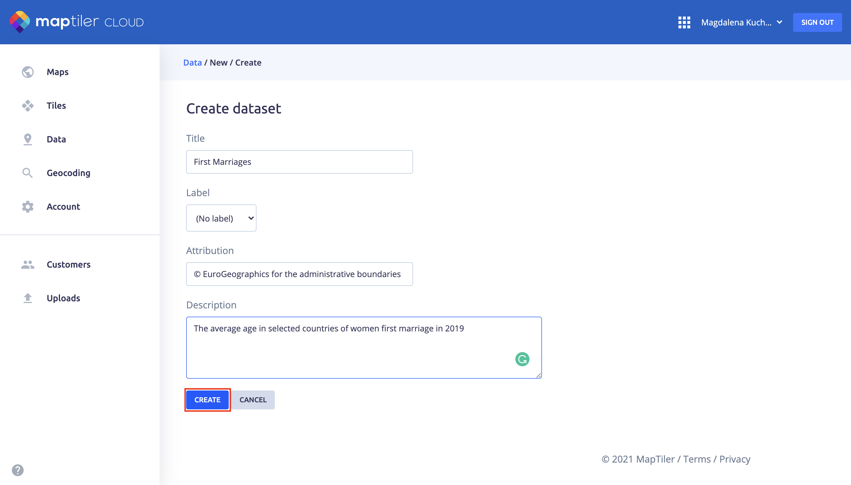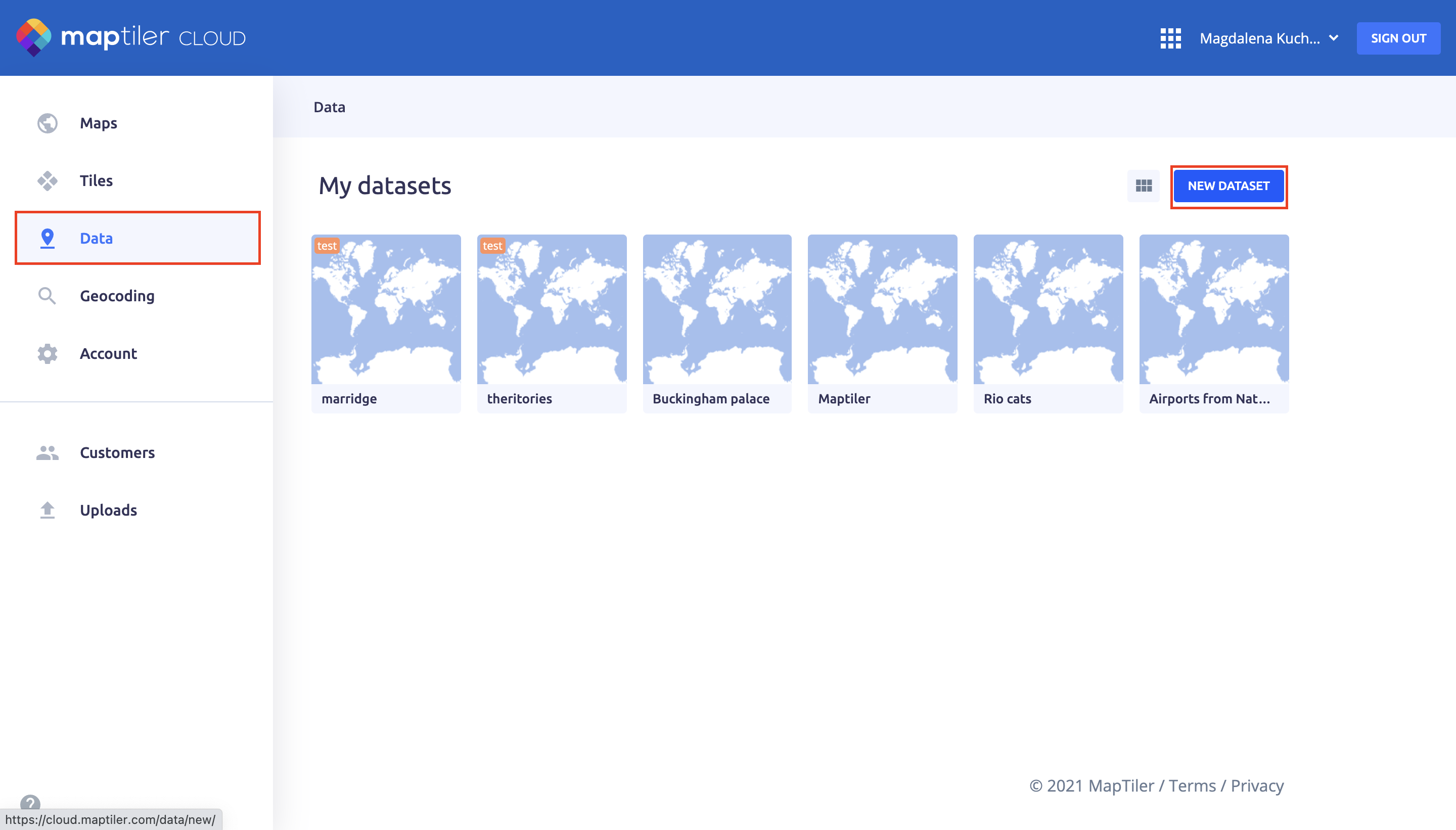 Go to MapTiler - maps in the Left Menu, select Data, and then select NEW DATASET.