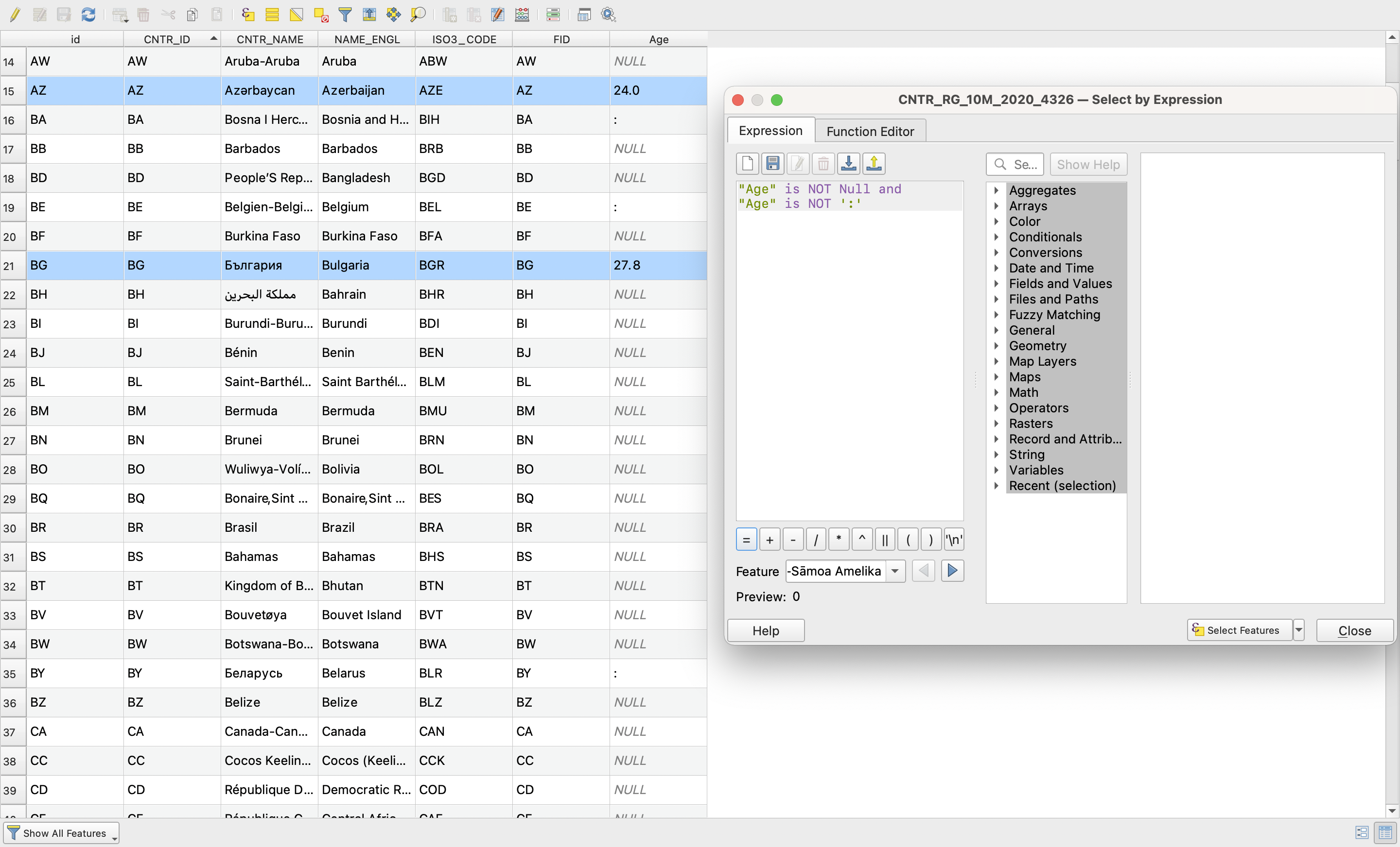 Right-click on CNTR_RG_10M_2020_4326.geojson → open attribute table → select feature using an expression: “Age” is NOT Null and “Age” is NOT ‘:’ This expression will select just countries with some value.