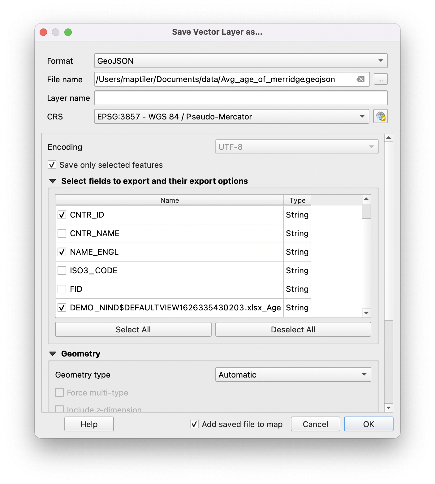 Now we can export: right-click on CNTR_RG_10M_2020_4326.geojson layer → export → Save Selected Features As and name it. In this phase, it is also possible to remove unnecessary attributes such as FID, CNTR_ID Age, or ISO3_CODE.