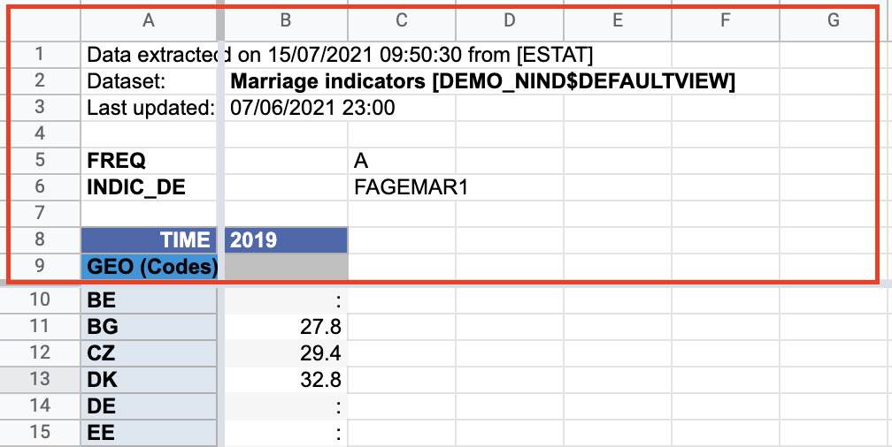 After download, it’s necessary to remove the header and footer of the spreadsheet and rename the headers of each column ideally to one word without spatial characters. The final document should have just one sheet with two columns named GEO_code and Age.