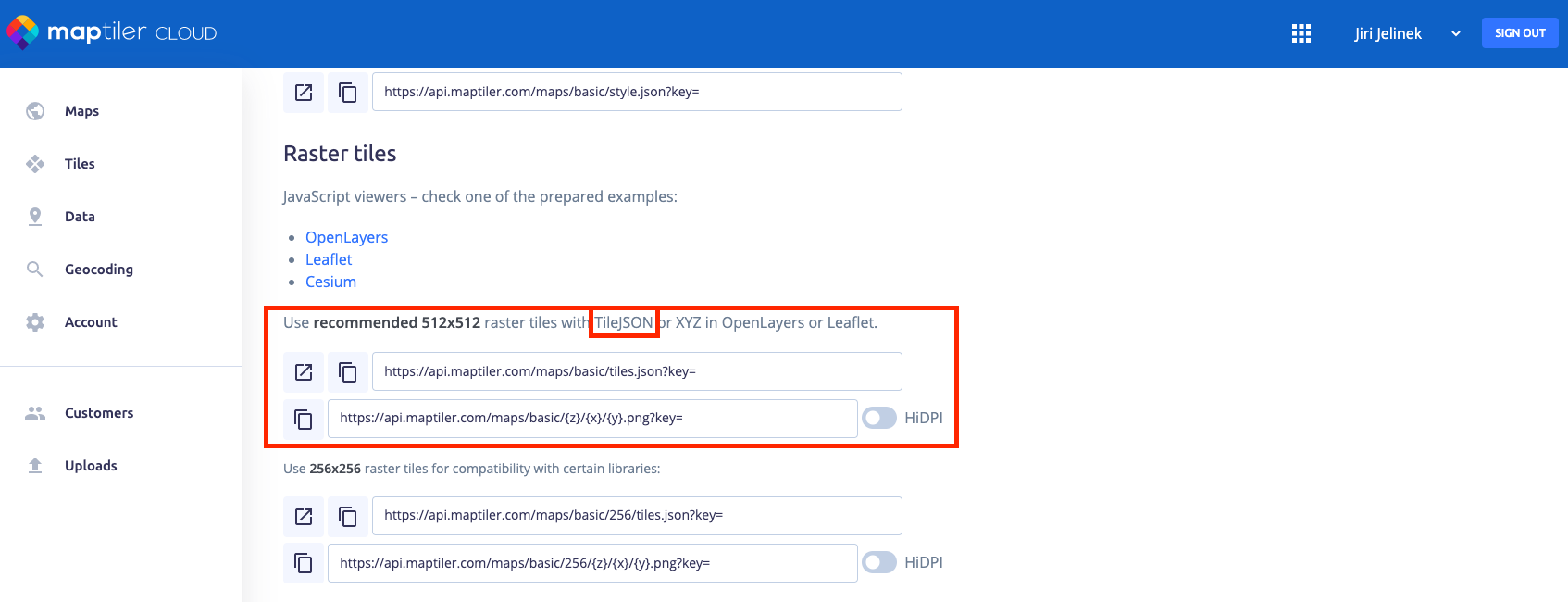 It stores information such as where to request the tileset, the name of the tileset, the attribution necessary for using the tileset. It is also universally regarded as an open standard for representing map metadata. The description of the latest version is available on GitHub. MapTiler strongly recommends using the TileJSON format instead of the XYZ URL format.