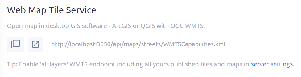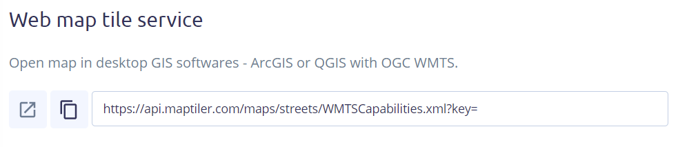 First, choose the style you want to add into your GIS software from the MapTiler or MapTiler Server administration and scroll down to the section called “Web map tile service.” There, copy the pre-rendered WMTS link.