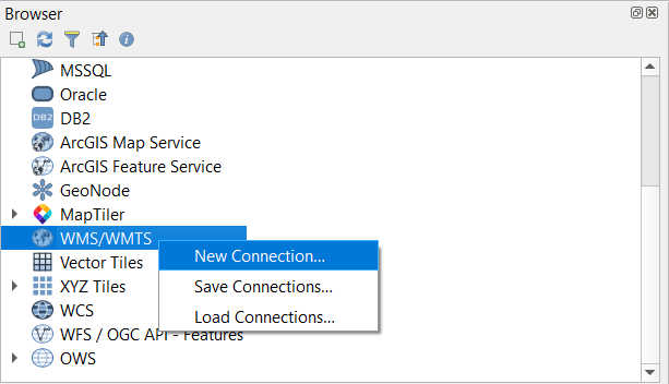 In QGIS, on the left is a section called “Browser.” There, you can browse data by folder, database, or service, including the “WMS/WMTS” services. To add a new WMTS, right-click and select “New Connection.”