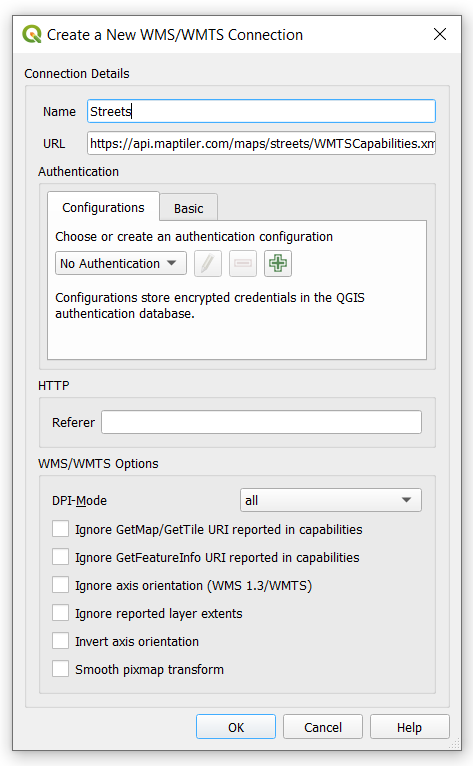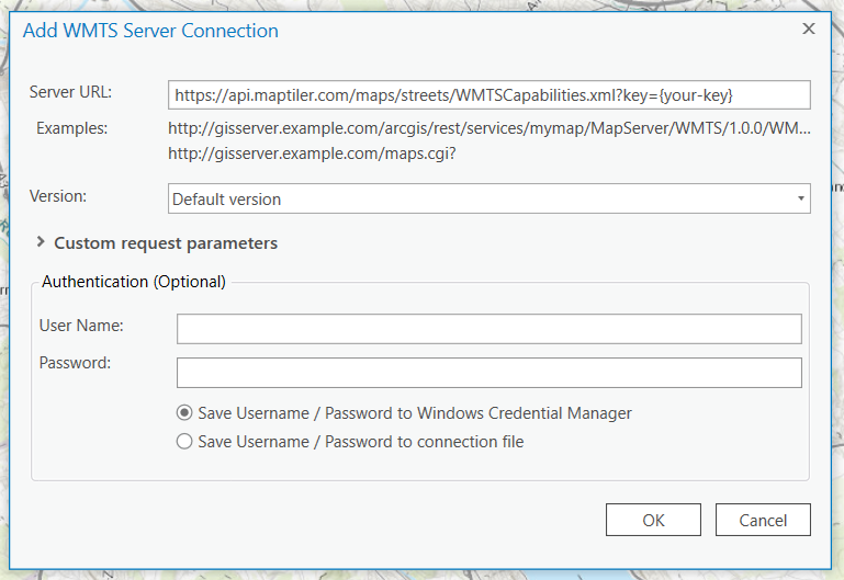 A new window will pop up. Paste the WMTS link copied from MapTiler/MapTiler Server to the “Server URL” field and click on “OK.”
