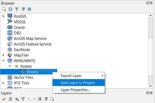 For adding the WMTS layer into the map in QGIS, double-click “Browser” on the layer or right-click on “Add Layer to Project.”
