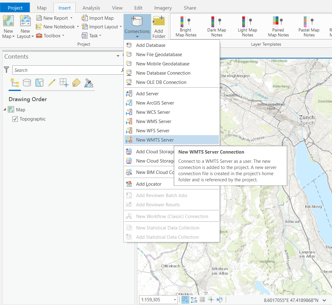 Adding web services in ArcGIS Pro is enabled under the “Connections” drop-down, under the “Insert” menu. Click on “Connections” and select “New WMTS Server”.