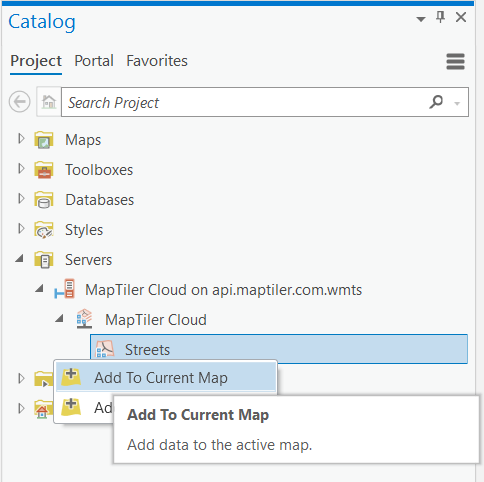 The connected WMTS can be found in “Catalog” under “Servers.” You can add the WMTS to the map by double-clicking on the layer or right-clicking on the layer and selecting “Add To Current Map.”
