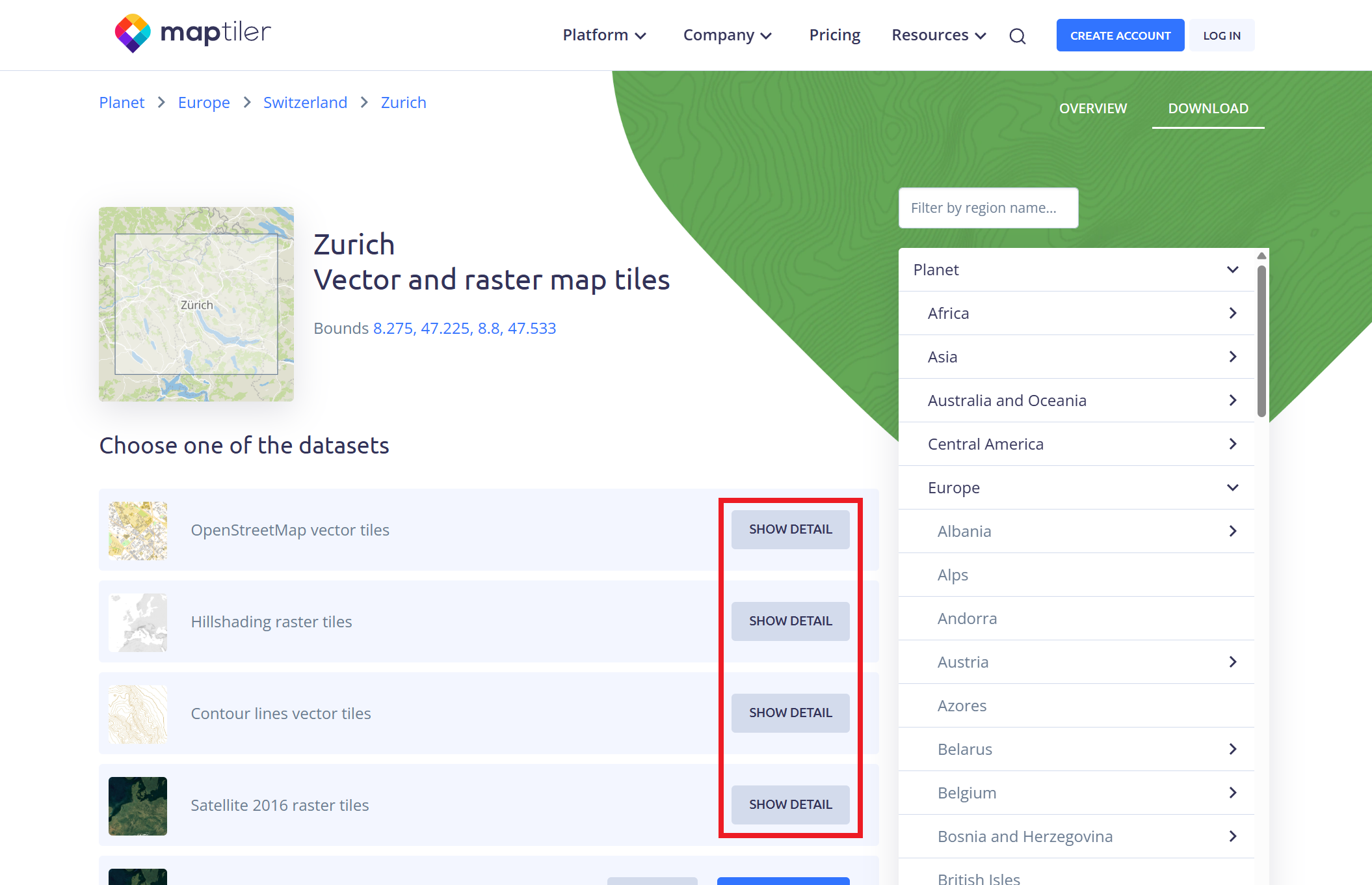 When you have your area of interest selected, click on the Show Detail button for all datasets you want to get:
