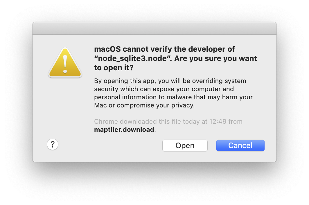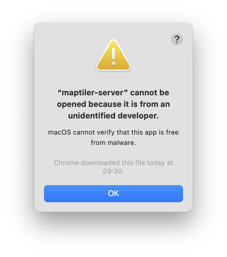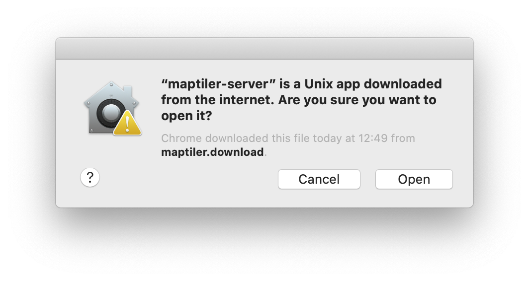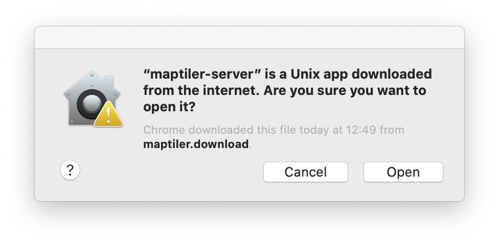 maptiler-server, you will see a window asking for permissions to open an app from an unidentified developer. In order to resolve this, you have to head to theSecurity & Privacysection of theSystem & Preferences, log in as administrator and allow to run themaptiler-server.