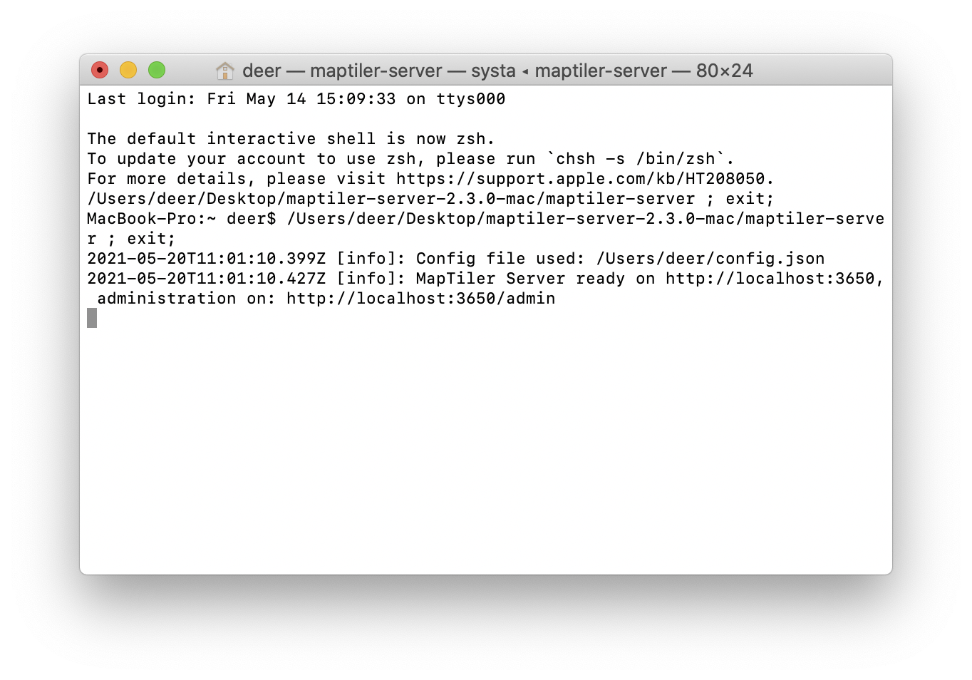 5. At this stage, the program should open in the Terminal with info about where to access the admin endpoint. The system trusts MapTiler Server now, you can click it open or use the terminal.