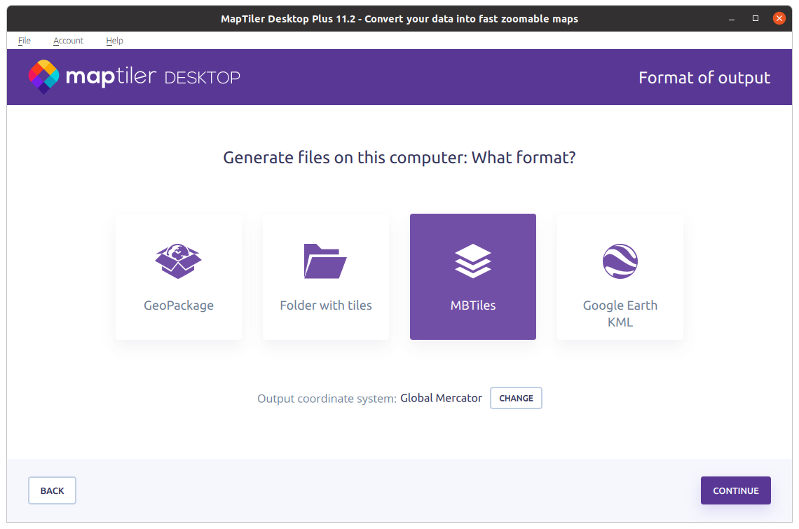 In the next step, MapTiler Engine will ask us in which format we want to convert our file. We will choose MBTiles and Global Mercator as the output coordinate system.