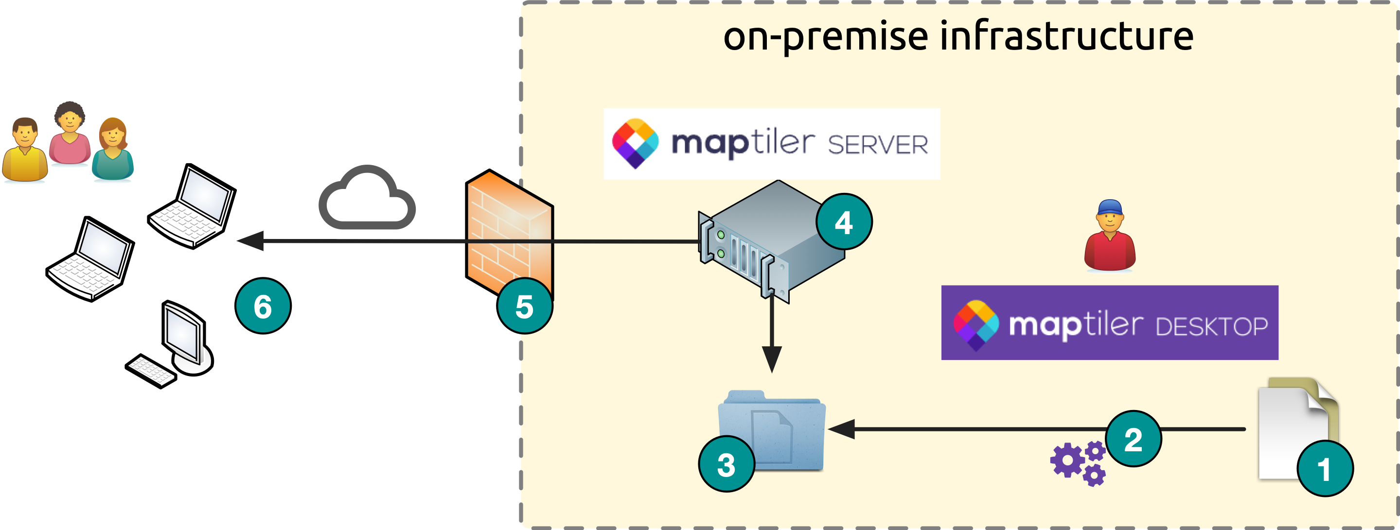 *.mbtilesfile format, which is optimized for fast retrieval.*.mbtileswill be stored on storage (3) which is accessible to the MapTiler server. -