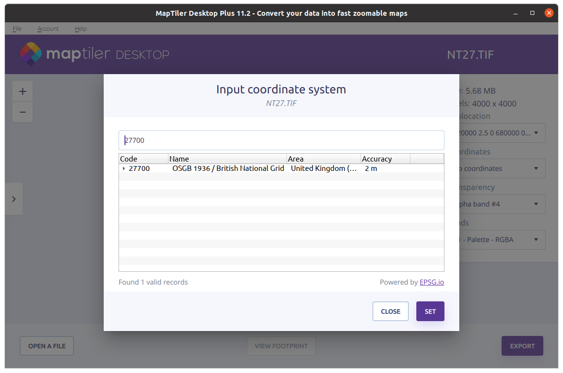 Then we will drag our GeoTIF image (it is possible to drag multiple images as well) over the MapTiler Engine window. The image will be loaded and showed on the background map. To position the image correctly in the geographic space, it is necessary to specify the coordinate reference system. Our image is in British National Grid (EPSG:27700).