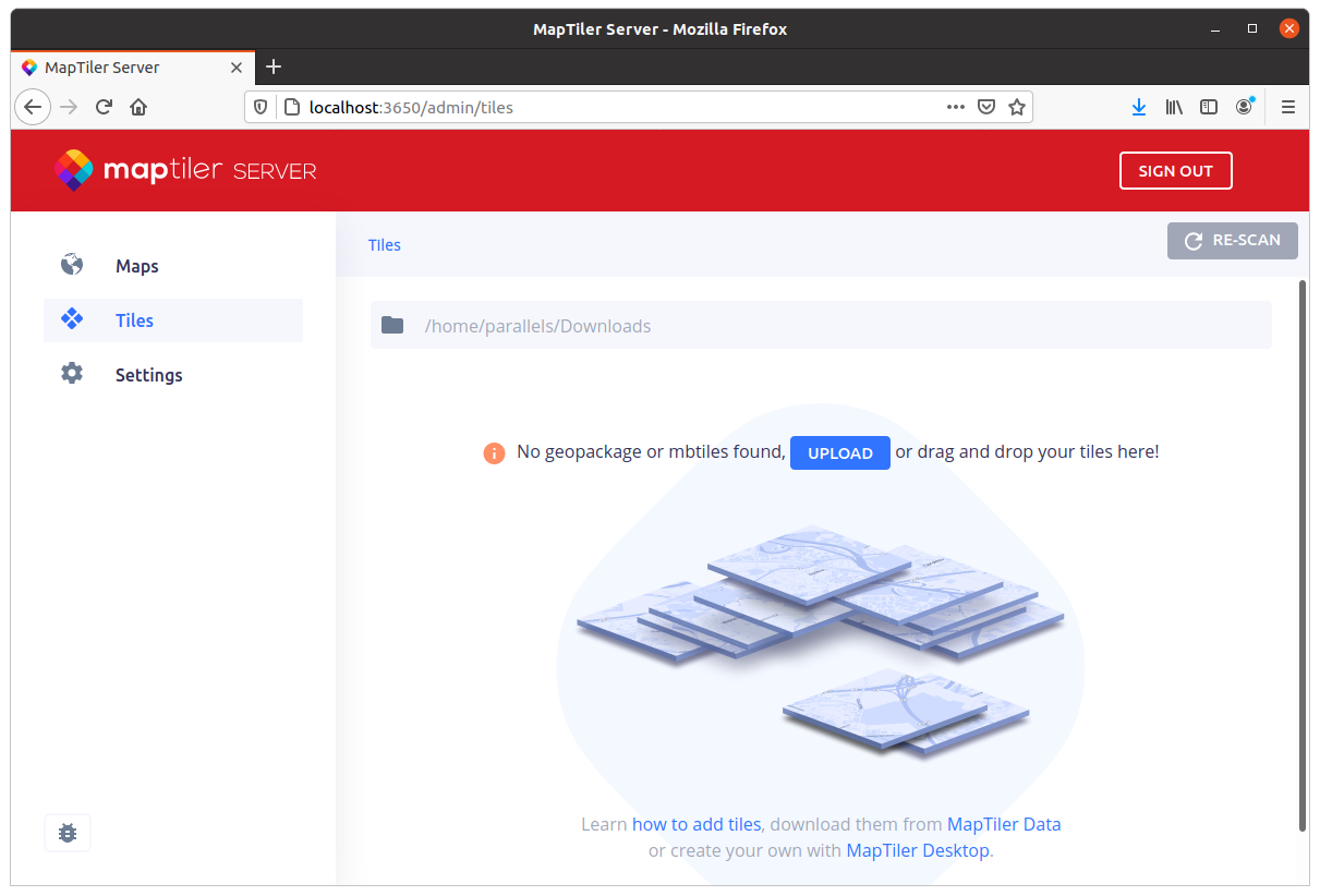 In the left menu, select Tiles and upload your mbtiles file. If you have access to the server, you can also copy the file into the MapTiler Server data folder. You can see which folder it is on the Tiles screen.