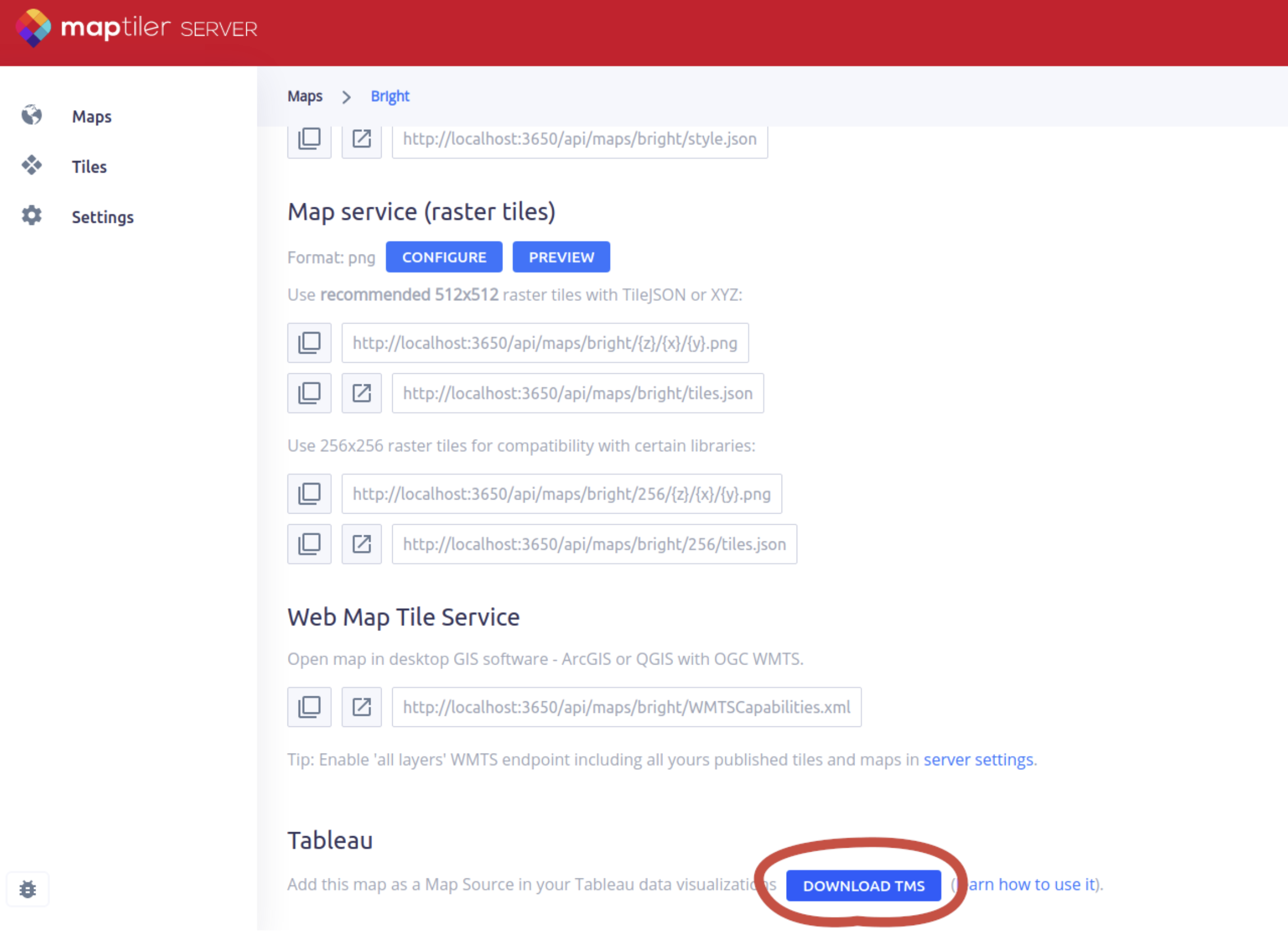 Get Tableau TMS from MapTiler Server