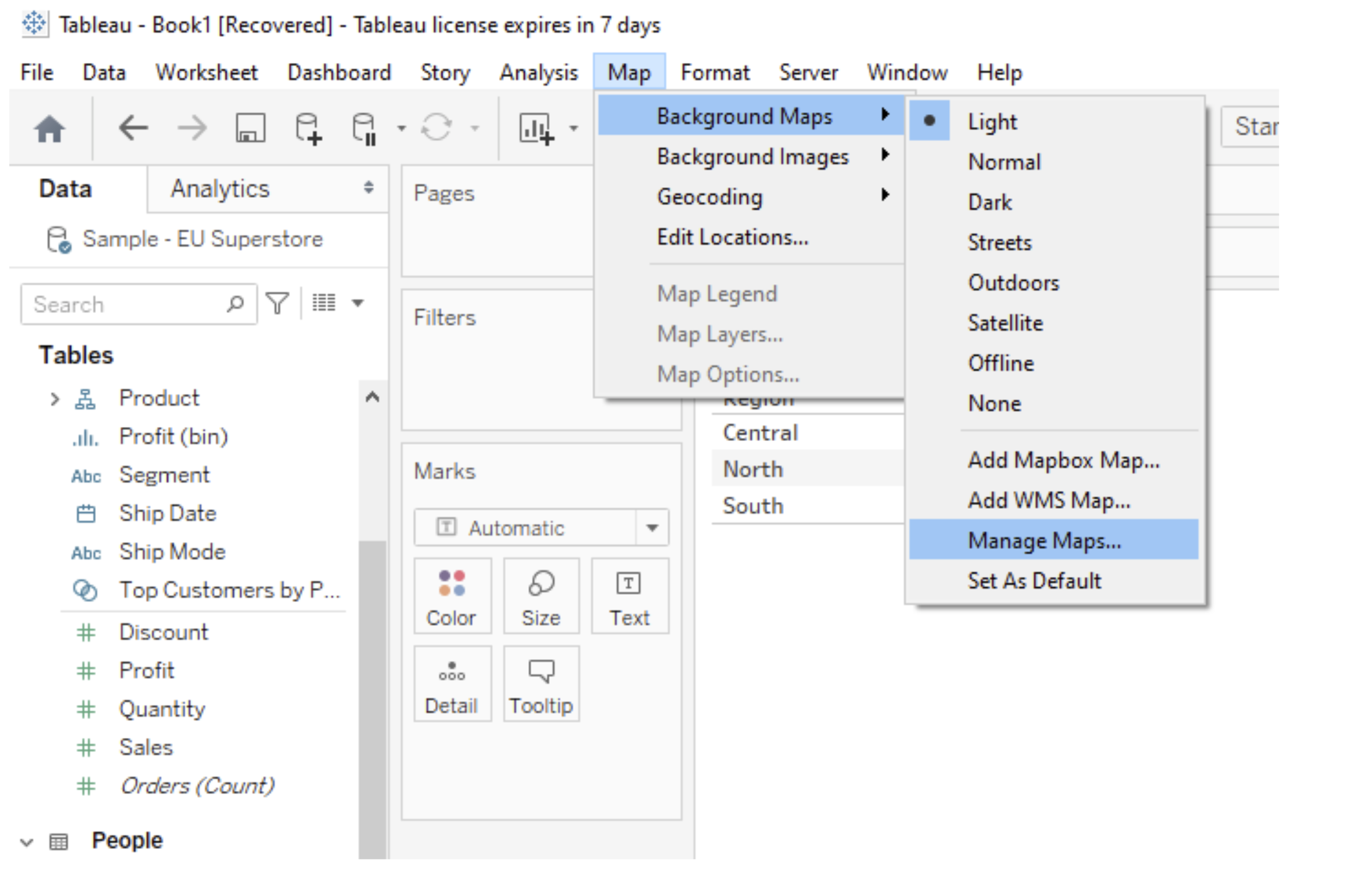 Now open Tableau and import the TMS file here. Open Map -> Background Maps -> Manage Maps…