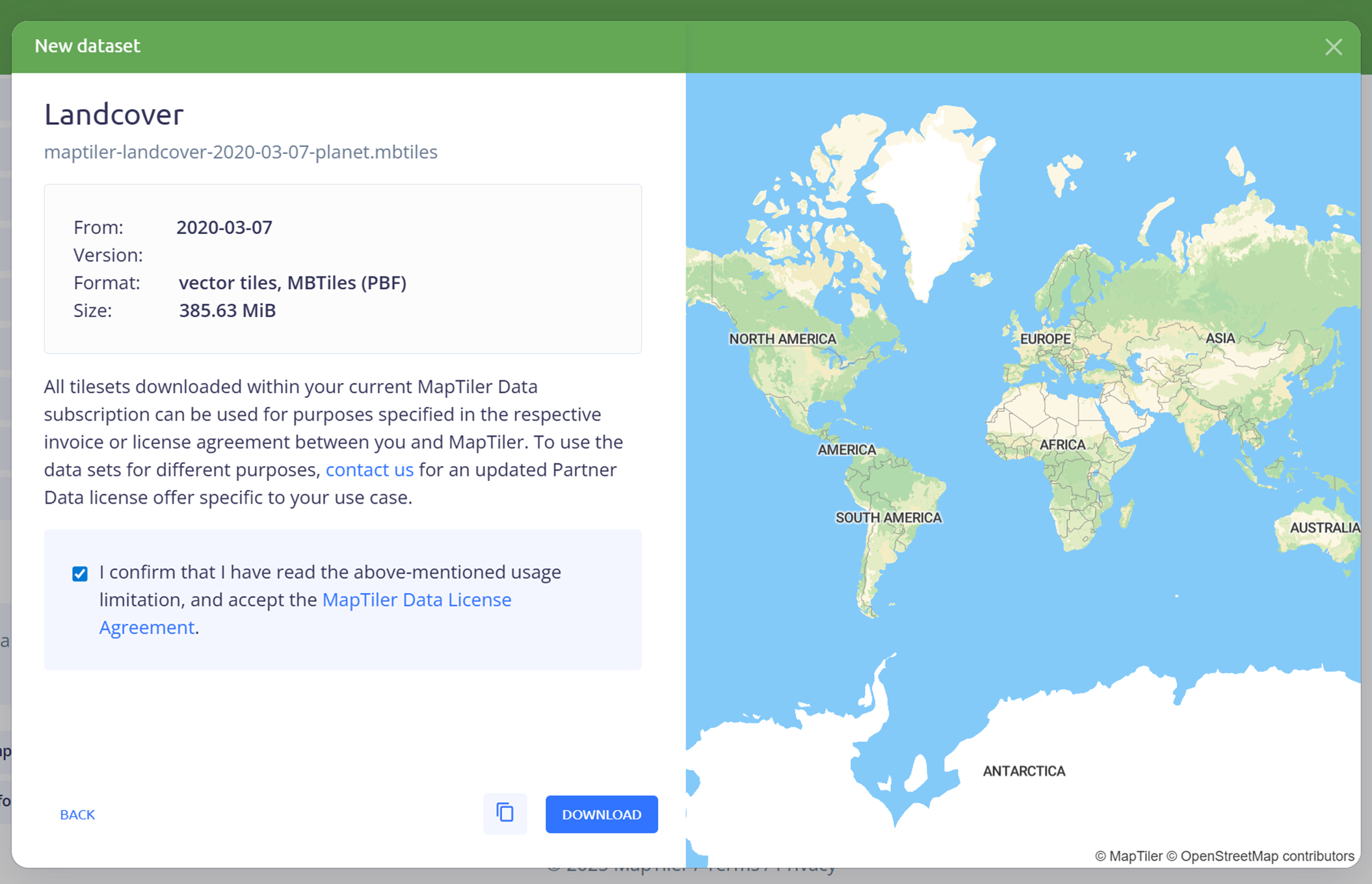Once you click on the Download button by your selected dataset and region and eventually pay for it, you can download the MBTiles right in the browser or use the command line solution.