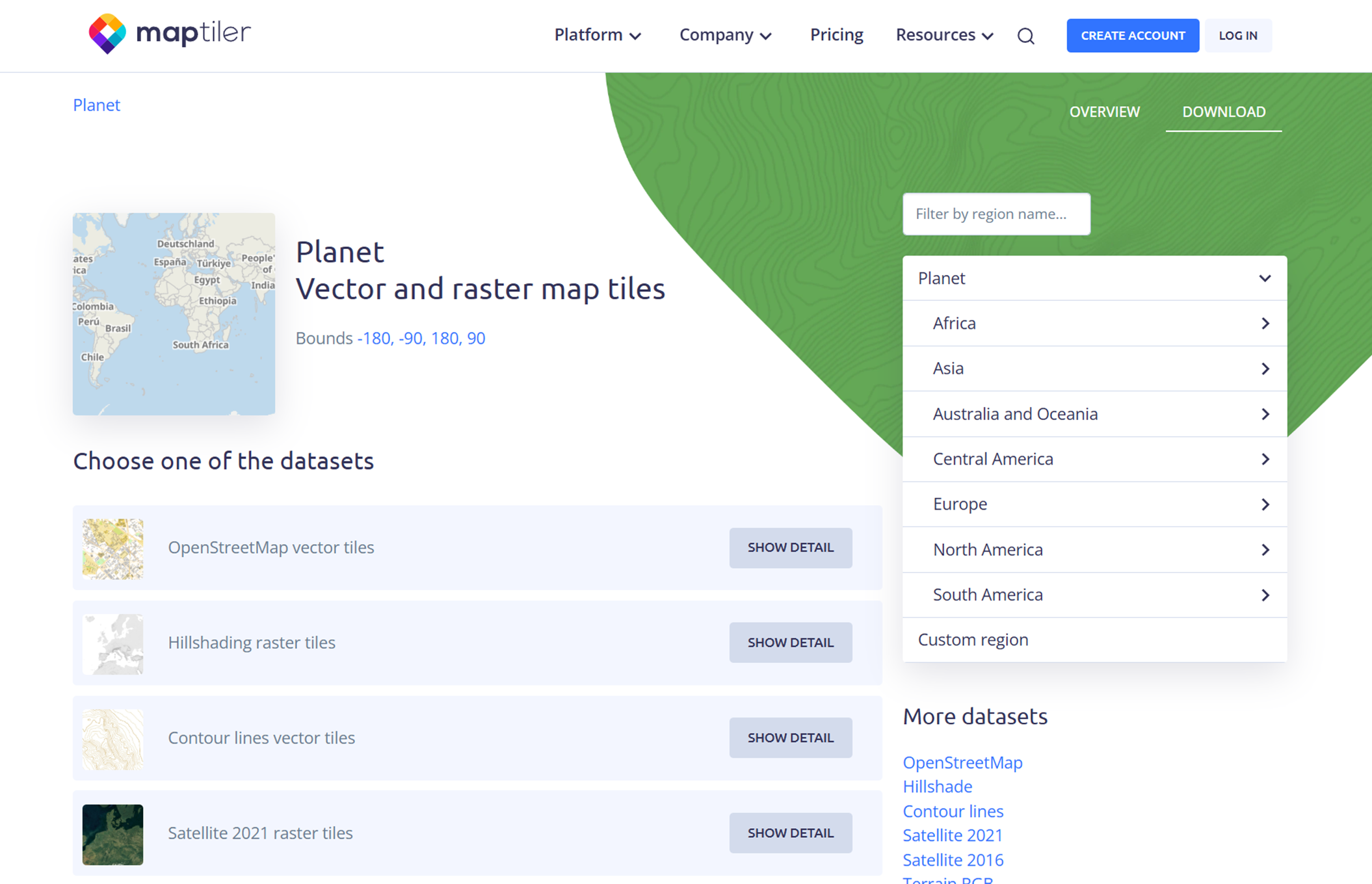 On the MapTiler website, if you navigate into the Platform | On-prem | Get map data section, you can click on DATASETS and see the following list of datasets: