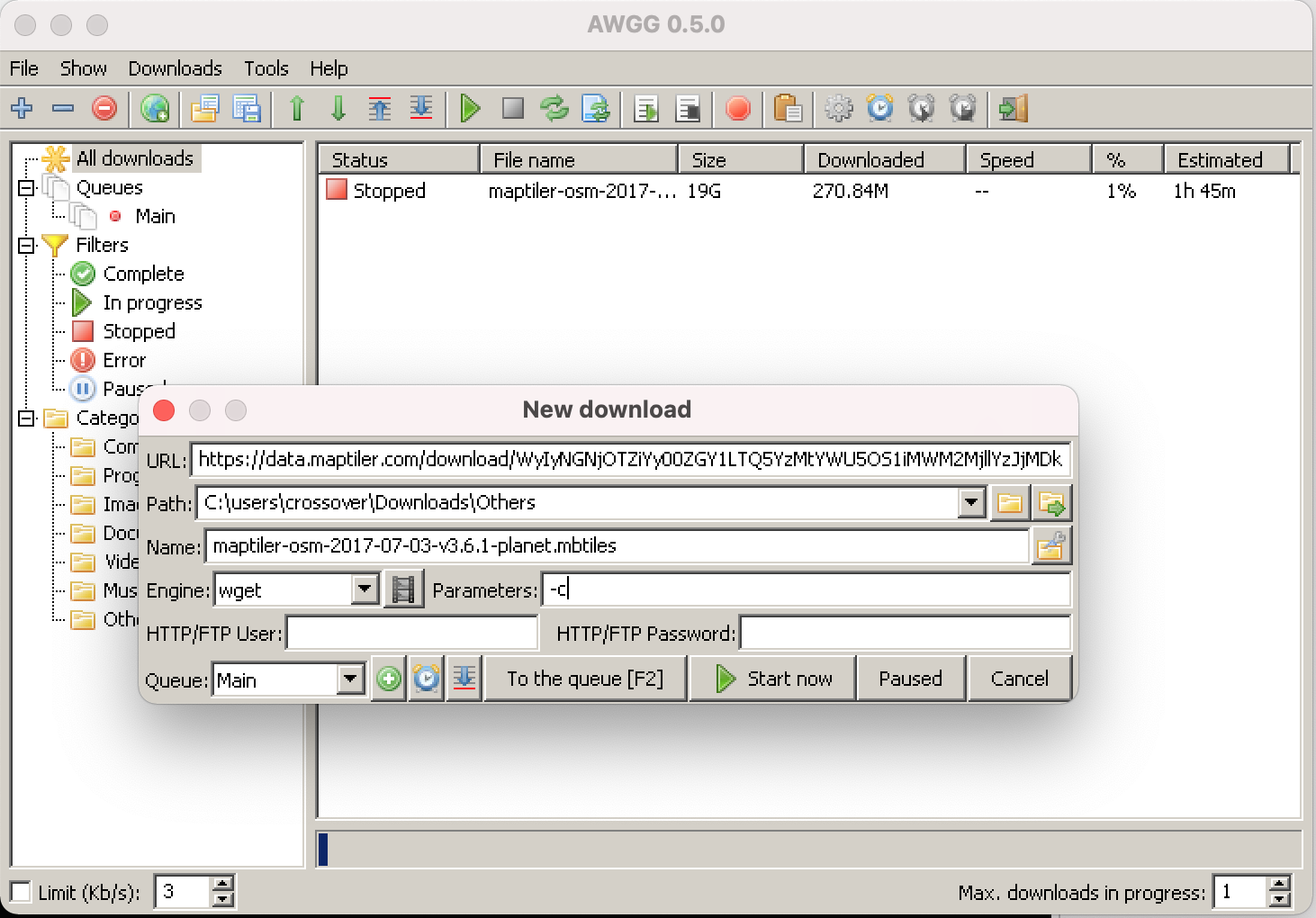 Downloading resources from MapTiler data can take some time, and if you are worried about accidentally closing the web browser and don’t want to use wget directly in the terminal, there are some GUI options available. The AWGG tool can also accomplish more than downloading using a web browser like setting bandwidth limits, queues, and scheduling.