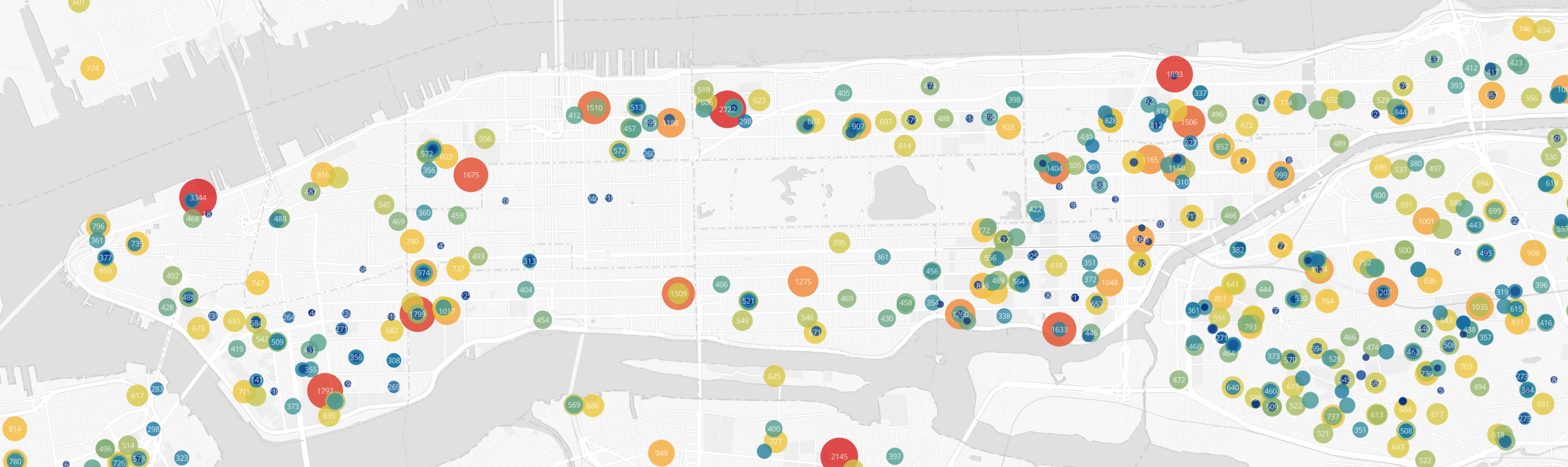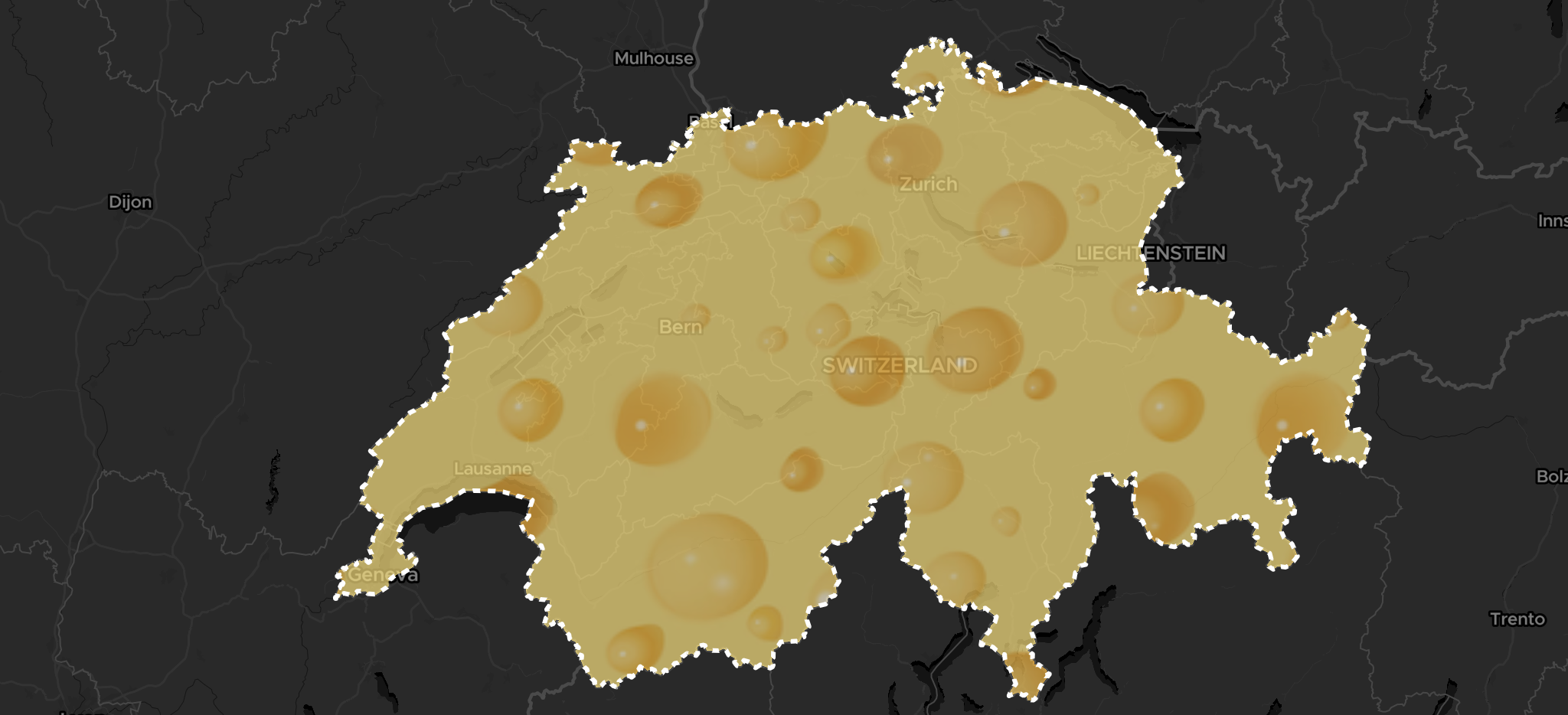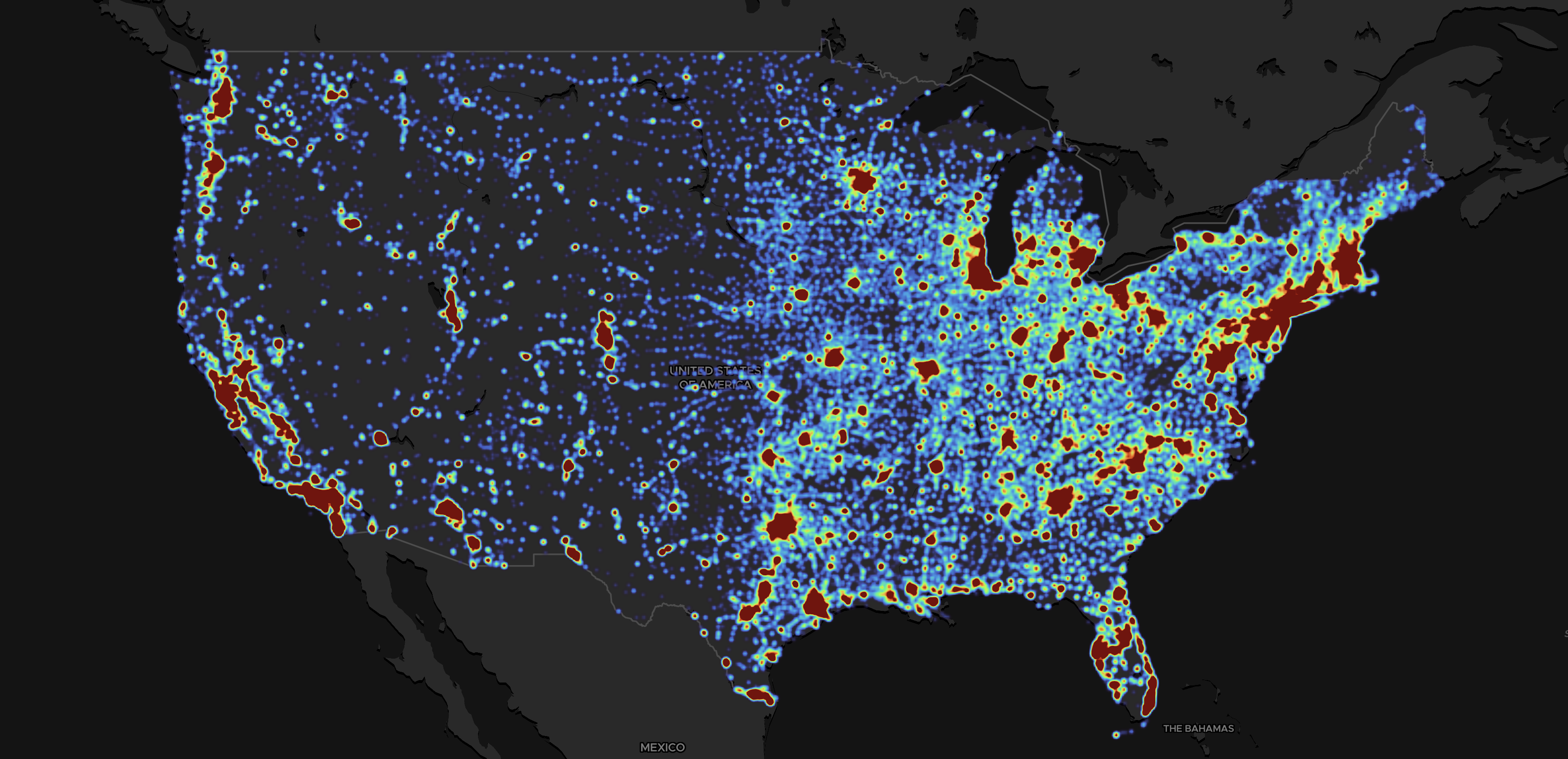 Some visualisations are created with a fixed geographic extent or zoom level in mind, whether it's a survey at the scale of a single neigbohood, or statitics at country scale. In this case, we want to tailor the color, radius, weight and intensity of the heatmap blobs exactely for this precise settings. In the following example, we disable the zoom compensation to make sure radii and intensity is never zoom-dependant: