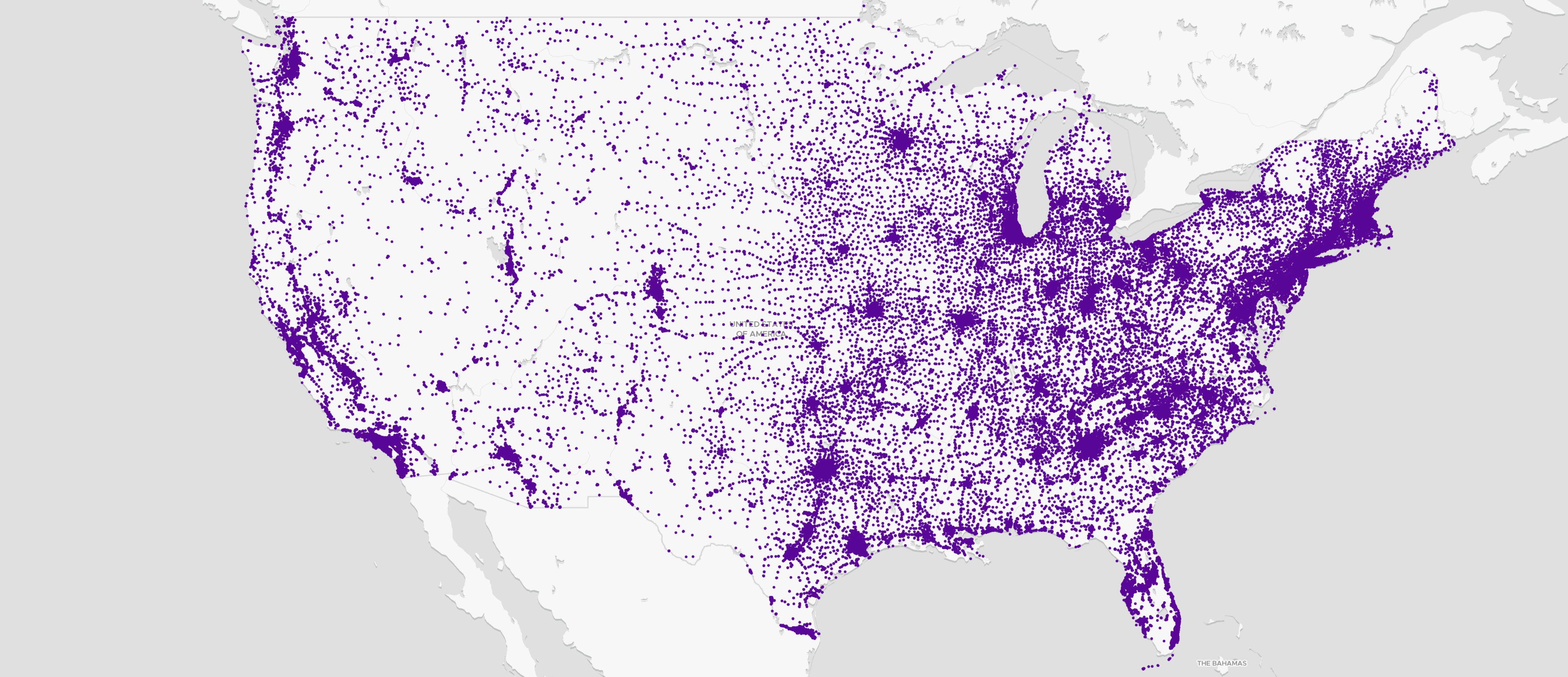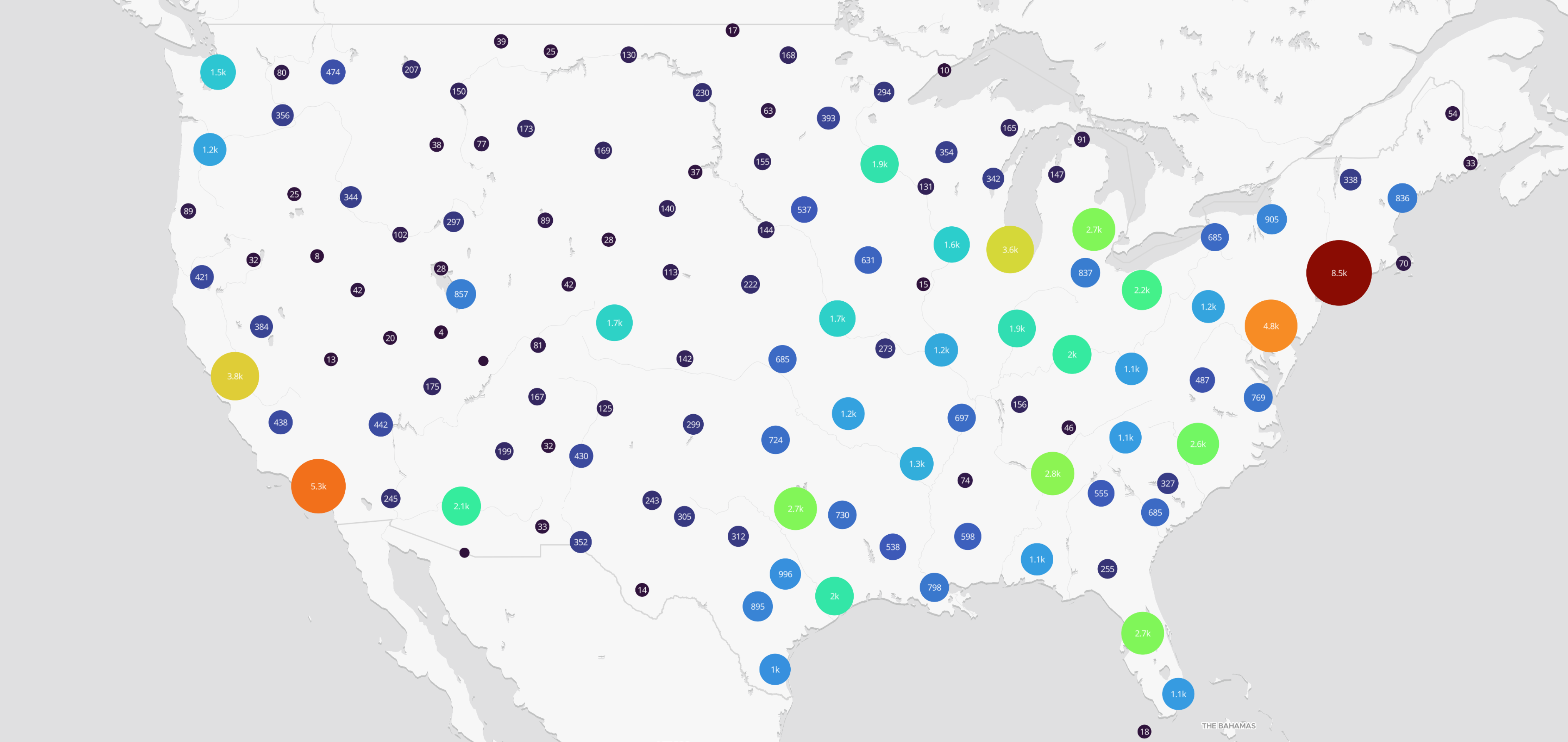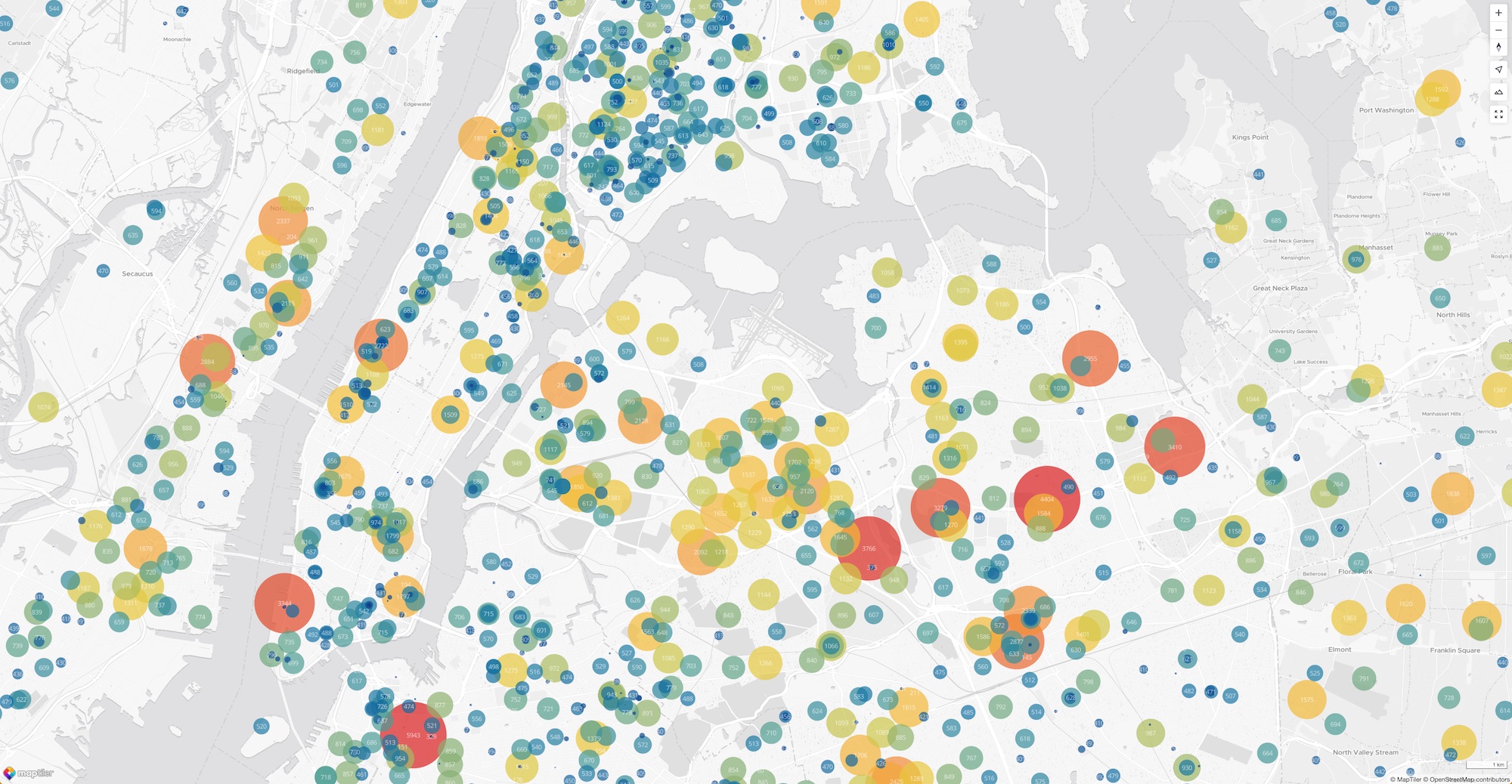 Some visualisations are created with a fixed geographic extent or zoom level in mind, whether it's a survey at the scale of a single neigbohood, or statitics at country scale. In this case, we want to tailor the color, radius, weight and intensity of the heatmap blobs exactely for this precise settings. In the following example, we disable the zoom compensation to make sure radii and intensity is never zoom-dependant: